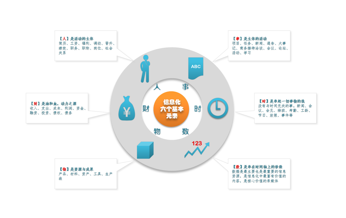 任何信息化主体都可以分解为“人·财·物·事·时·数”六个基本信息元素的状态与活动,因此,信息化的实质就是这六个基本元素的信息活动变化与状态呈现的过程。